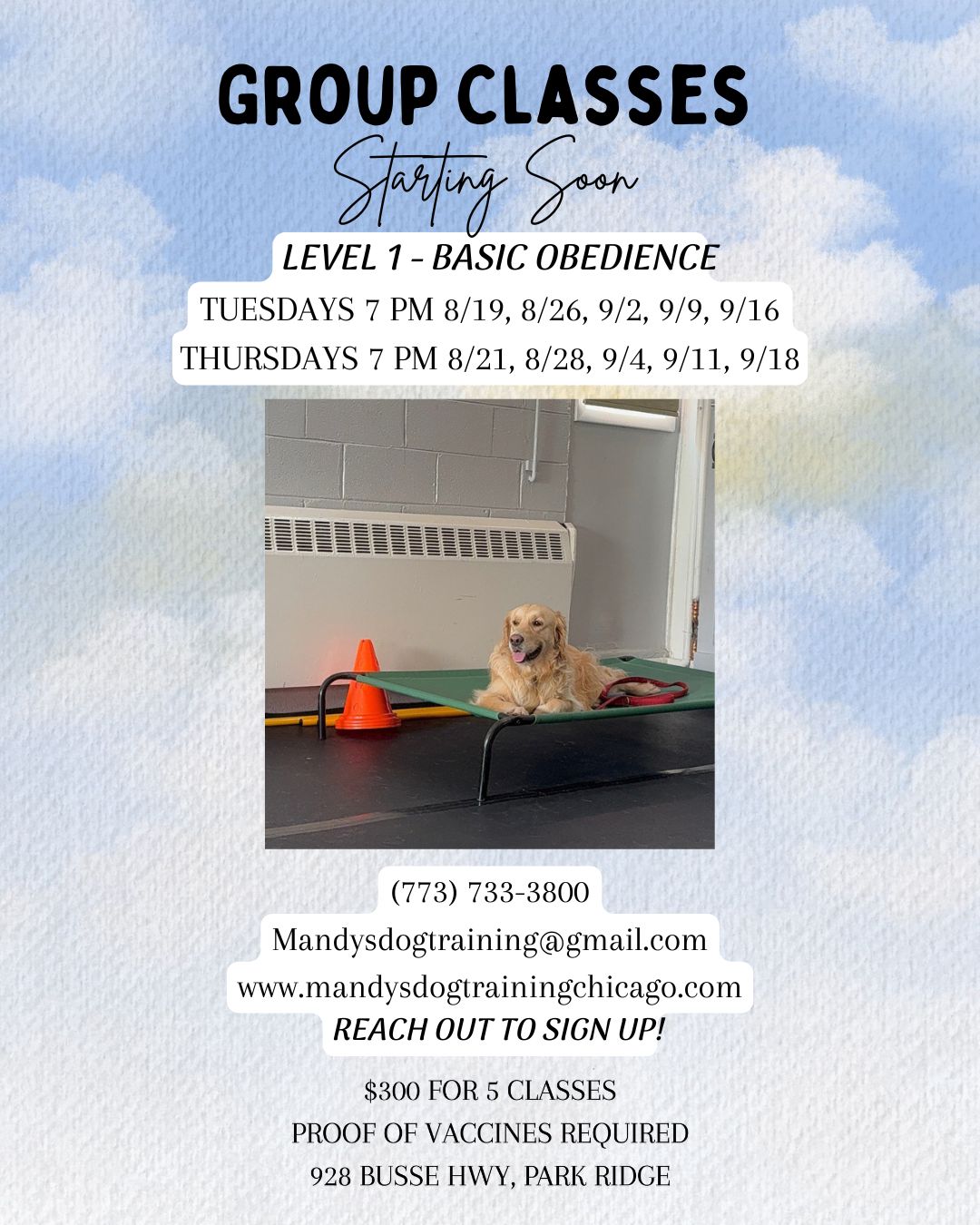 Is your pup ready to learn some manners? We’re excited to announce that group classes are back this August at Mandy’s Dog Training in Chicago! Whether you’ve got a young puppy or an older dog who needs a refresher on the basics, our Level 1 – Basic Obedience class is the perfect place to start.